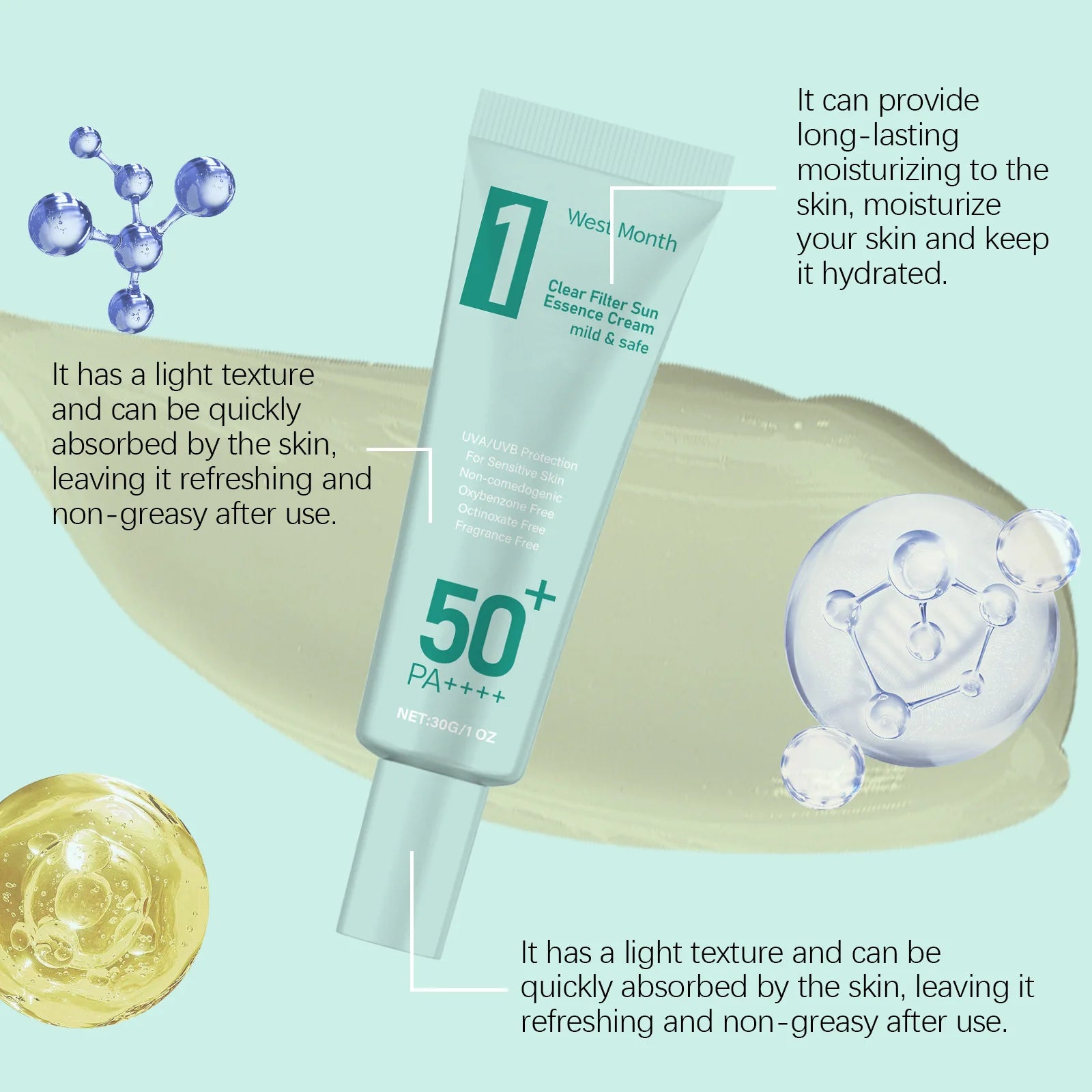 The West Month Clear Filter Sun Essence Cream SPF50+ PA++++ provides superior broad-spectrum protection against UVA and UVB rays while keeping your skin hydrated and smooth.