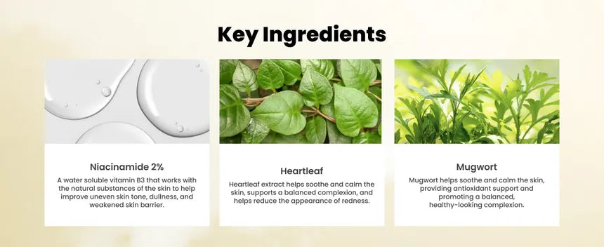 Heartleaf Extract (Houttuynia Cordata) – calms irritation and reduces redness