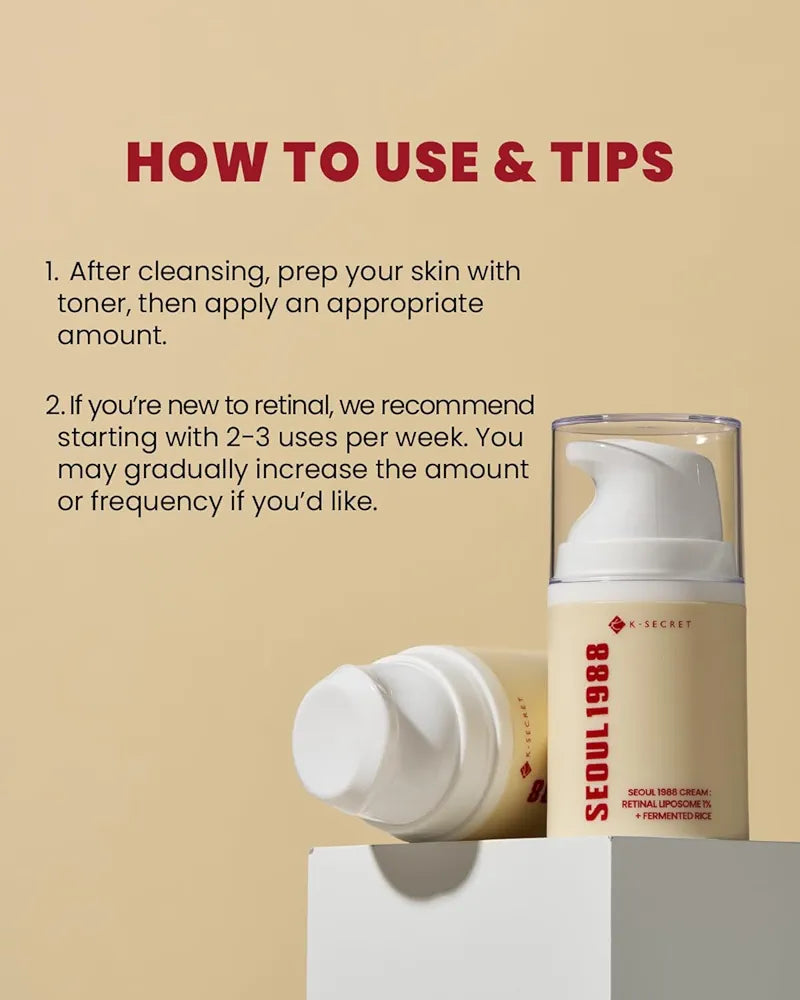 The K-Secret Seoul 1988 Cream is a luxurious Korean anti-aging moisturizer formulated with 1% Retinal Liposome and Fermented Rice Extract.